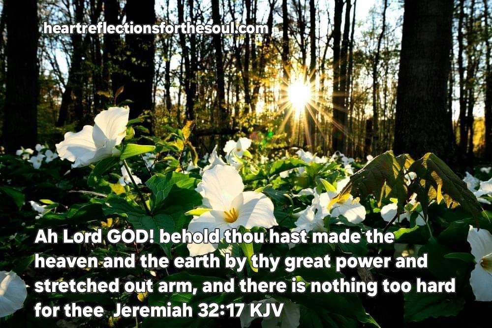 Ah, Lord God! Behold, You have made the heavens and the earth by Your great power and outstretched arm, there is nothing too hard for You. “Behold, I am the Lord, the God of all flesh. Is there anything too hard for Me?” Jeremiah 32:17, 27 NKJV