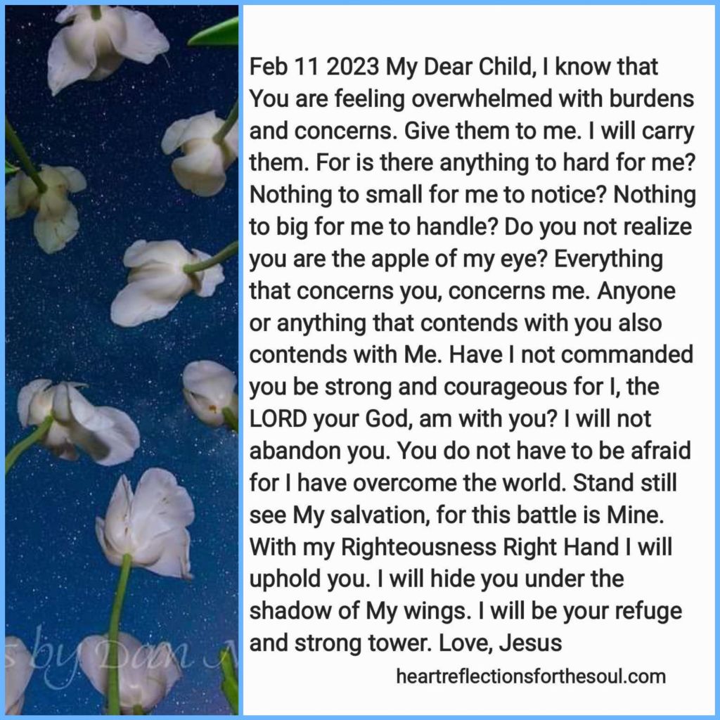 I know that You are feeling overwhelmed with burdens and concerns. Give them to me. I will carry them. For is there anything to hard for me? Nothing to small for me to notice? Nothing to big for me to handle? Do you not realize you are the apple of my eye? Everything that concerns you, concerns me. Anyone or anything that contends with you also contends with Me. Have I not commanded you be strong and courageous for I, the LORD your God, am with you? I will not abandon you. You do not have to be afraid for I have overcome the world. Stand still see My salvation, for this battle is Mine. With my Righteousness Right Hand I will uphold you. I will hide you under the shadow of My wings. I will be your refuge and strong tower.