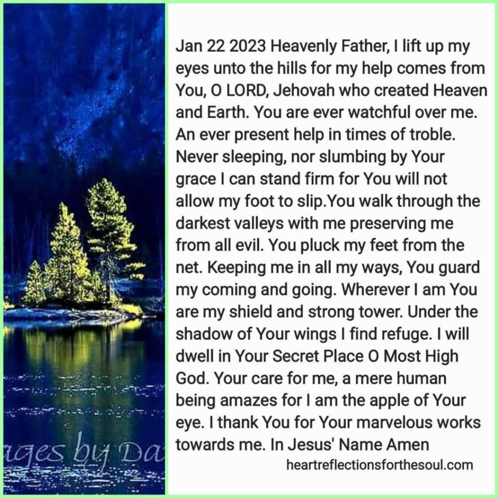 Heavenly Father, I lift up my eyes unto the hills for my help comes from You, O LORD, Jehovah who created Heaven and Earth. You are ever watchful over me. An ever present help in times of trouble. Never sleeping, nor slumbing by Your grace, I can stand firm for You will not allow my foot to slip.You walk through the darkest valleys with me preserving me from all evil. You pluck my feet from the net. Keeping me in all my ways, You guard my coming and going. Wherever I am, You are my shield and strong tower. Under the shadow of Your wings, I find refuge. I will dwell in Your Secret Place O Most High God. Your care for me, a mere human being, amazes me, for I am the apple of Your eye. I thank You for Your marvelous works towards me. In Jesus’ Name Amen