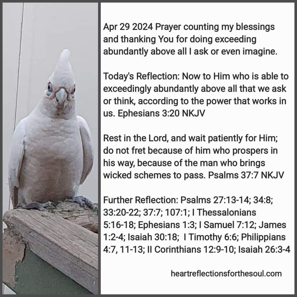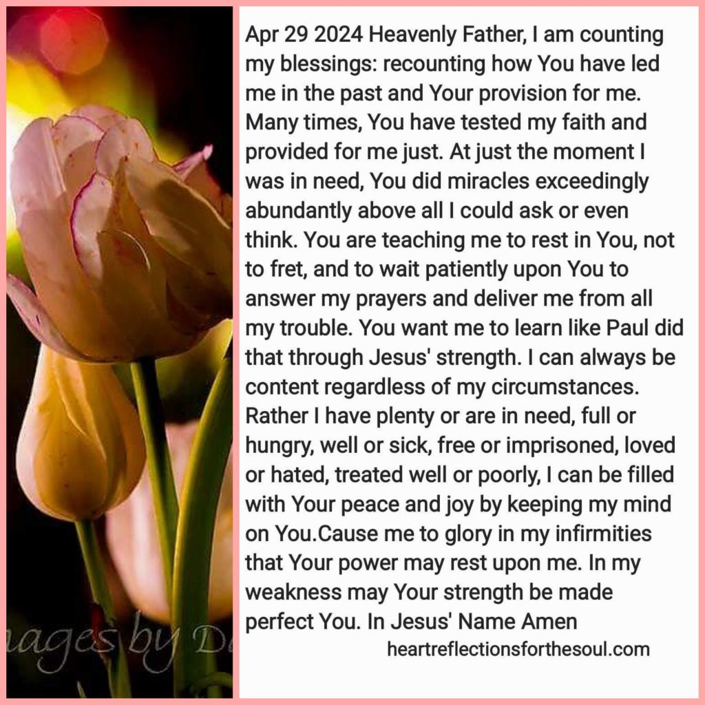 Heavenly Father, I am counting my blessings: recounting how You have led me in the past and Your provision for me. Many times, You have tested my faith and provided for me just. At just the moment I was in need, You did miracles exceedingly abundantly above all I could ask or even think. You are teaching me to rest in You, not to fret, and to wait patiently upon You to answer my prayers and deliver me from all my trouble. You want me to learn like Paul did that through Jesus’ strength. I can always be content regardless of my circumstances. Rather I have plenty or are in need, full or hungry, well or sick, free or imprisoned, loved or hated, treated well or poorly, I can be filled with Your peace and joy by keeping my mind on You. Cause me to glory in my infirmities that Your power may rest upon me. In my weakness may Your strength be made perfect You. In Jesus’ Name Amen