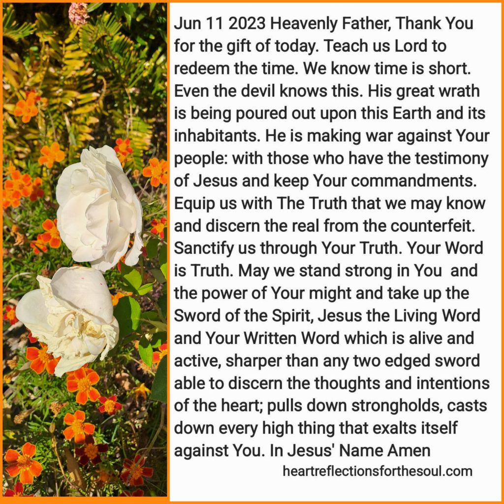 inhabitants. He is making war against Your people: with those who have the testimony of Jesus and keep Your commandments. Equip us with The Truth that we may know and discern the real from the counterfeit. Sanctify us through Your Truth. Your Word is Truth. May we stand strong in You and the power of Your might and take up the Sword of the Spirit, Jesus the Living Word and Your Written Word which is alive and active, sharper than any two edged sword able to discern the thoughts and intentions of the heart; pulls down strongholds, casts down every high thing that exalts itself against You. In Jesus’ Name Amen