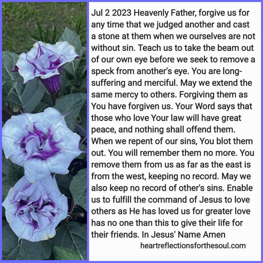 Heavenly Father, forgive us for any time that we judged another and cast a stone at them when we ourselves are not without sin. Teach us to take the beam out of our own eye before we seek to remove a speck from another’s eye. You are long-suffering and merciful. May we extend the same mercy to others. Forgiving them as You have forgiven us. Your Word says that those who love Your law will have great peace, and nothing shall offend them. When we repent of our sins, You blot them out. You will remember them no more. You remove them from us as far as the east is from the west, keeping no record. May we also keep no record of other’s sins. Enable us to fulfill the command of Jesus to love others as He has loved us for greater love has no one than this to give their life for their friends. In Jesus’ Name Amen