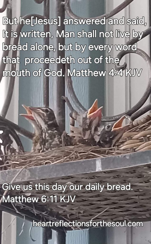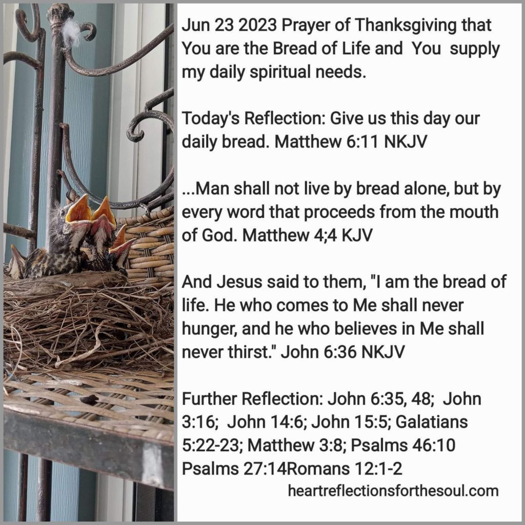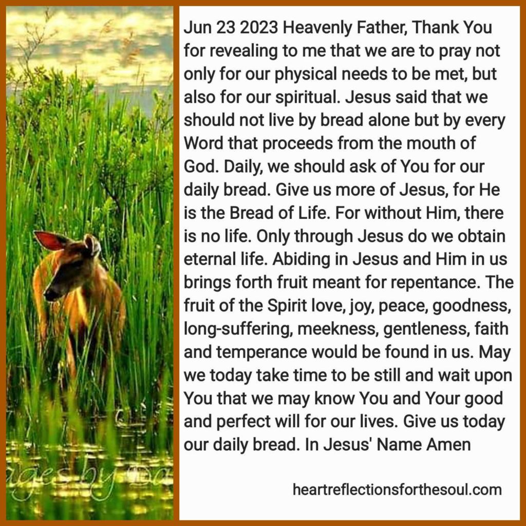 Heavenly Father, Thank You for revealing to me that we are to pray not only for our physical needs to be met, but also for our spiritual. Jesus said that we should not live by bread alone but by every Word that proceeds from the mouth of God. Daily, we should ask of You for our daily bread. Give us more of Jesus, for He is the Bread of Life. For without Him, there is no life. Only through Jesus do we obtain eternal life. Abiding in Jesus and Him in us brings forth fruit meant for repentance. The
