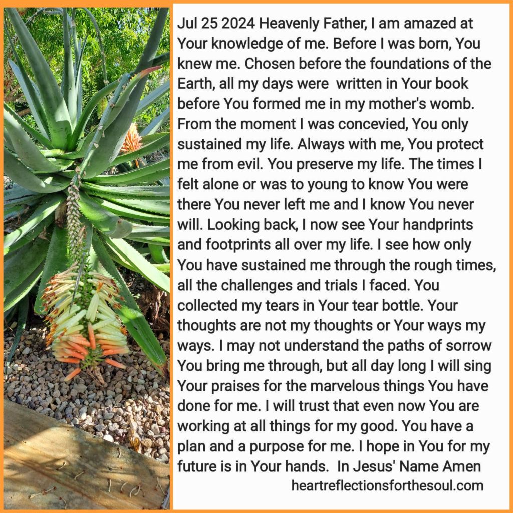 Heavenly Father, I am amazed at Your knowledge of me. Before I was born, You knew me. Chosen before the foundations of the Earth, all my days were written in Your book before You formed me in my mother’s womb. From the moment I was concevied, You only sustained my life. Always with me, You protect me from evil. You preserve my life. The times I felt alone or was to young to know You were there You never left me and I know You never will. Looking back, I now see Your handprints and footprints all over my life. I see how only You have sustained me through the rough times, all the challenges and trials I faced. You collected my tears in Your tear bottle. Your thoughts are not my thoughts or Your ways my ways. I may not understand the paths of sorrow You bring me through, but all day long, I will sing Your praises for the marvelous things You have done for me. I will trust that even now, You are working at all things for my good. You have a plan and a purpose for me. I hope in You for my future is in Your hands. In Jesus’ Name Amen