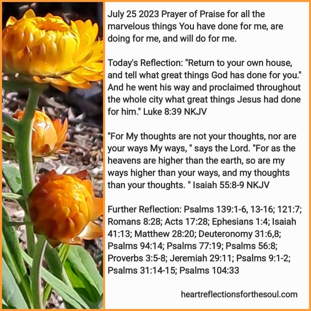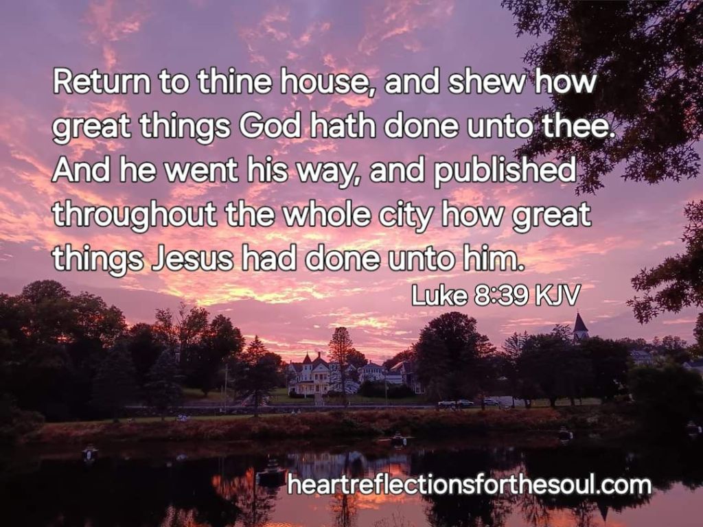 Today’s Reflection: “Return to your own house, and tell what great things God has done for you.” And he went his way and proclaimed throughout the whole city what great things Jesus had done for him.” Luke 8:39 NKJV