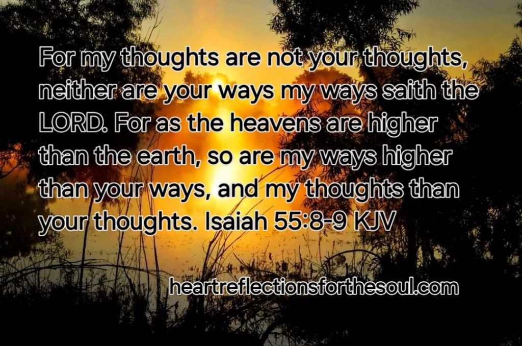 “For My thoughts are not your thoughts, nor are your ways My ways, ” says the Lord. “For as the heavens are higher than the earth, so are my ways higher than your ways, and my thoughts than your thoughts. ” Isaiah 55:8-9 NKJV