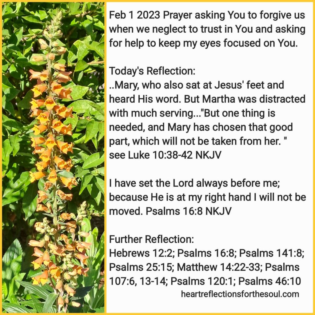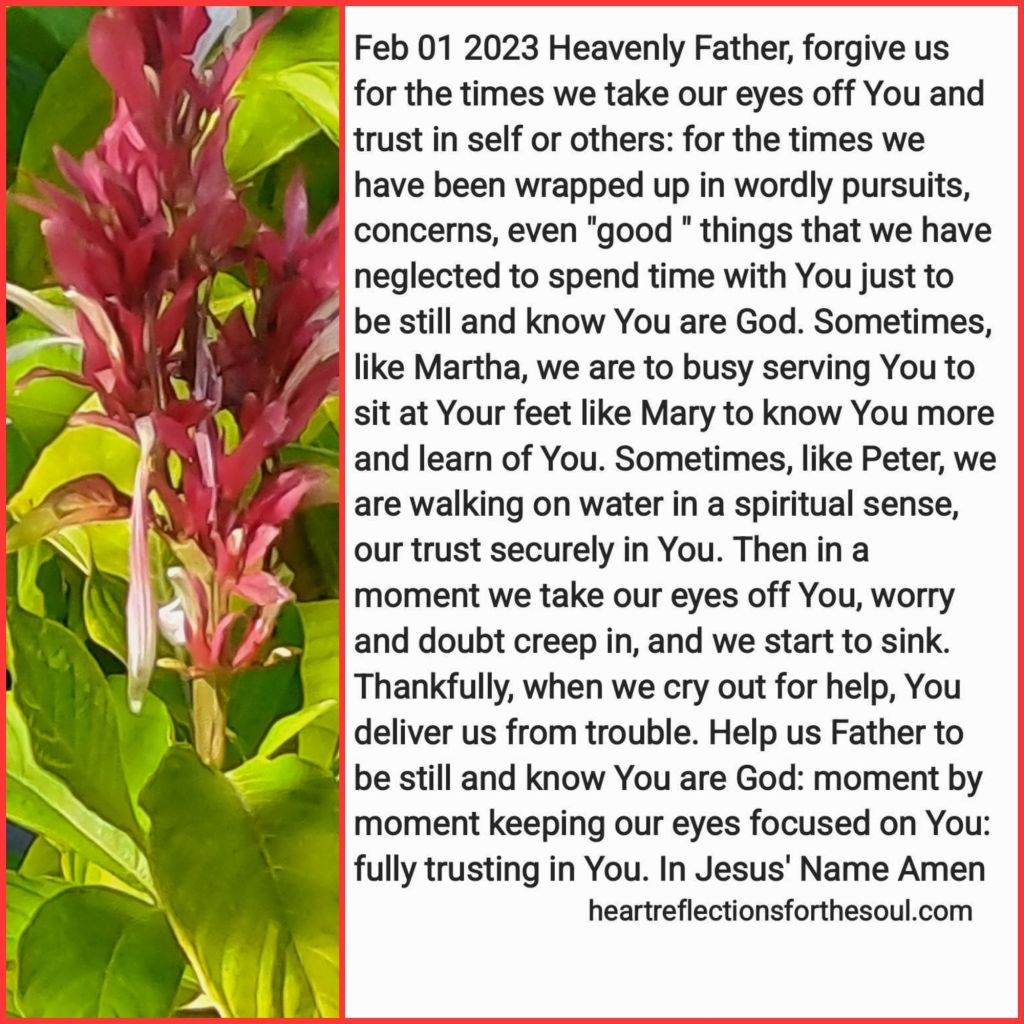 Heavenly Father, forgive us for the times we take our eyes off You and trust in self or others: for the times we have been wrapped up in wordly pursuits, concerns, even “good ” things that we have neglected to spend time with You just to be still and know You are God. Sometimes, like Martha, we are to busy serving You to sit at Your feet like Mary to know You more and learn of You. Sometimes, like Peter, we are walking on water in a spiritual sense, our trust securely in You. Then, in a moment, we take our eyes off. You, worry, and doubt creep in, and we start to sink. Thankfully, when we cry out for help, You deliver us from trouble. Help us Father to be still and know You are God: moment by moment keeping our eyes focused on You: fully trusting in You. In Jesus’ Name Amen
