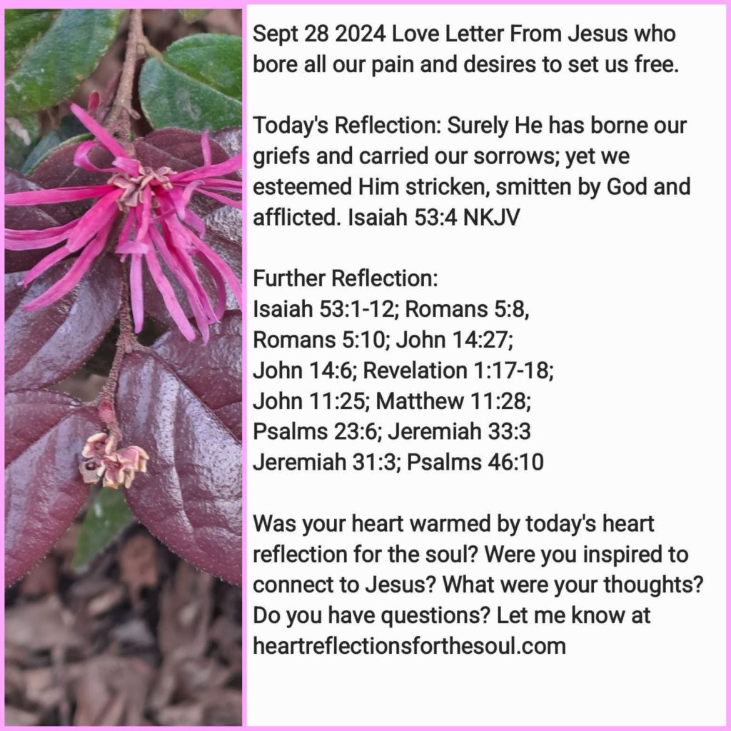 Today’s Reflection: Surely He has borne our griefs and carried our sorrows; yet we esteemed Him stricken, smitten by God and afflicted. Isaiah 53:4 NKJV