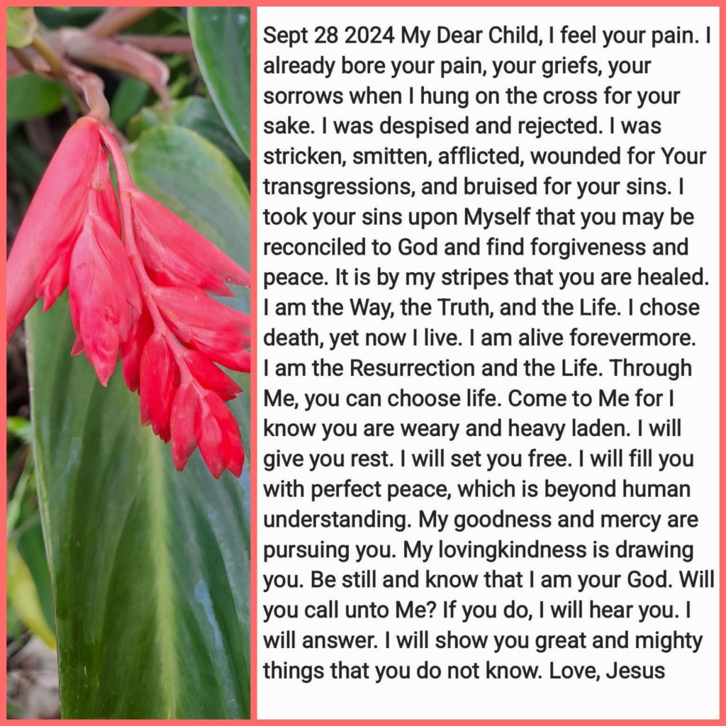 I feel your pain. I already bore your pain, your griefs, your sorrows when I hung on the cross for your sake. I was despised and rejected. I was stricken, smitten, afflicted, wounded for Your transgressions, and bruised for your sins. I took your sins upon Myself that you may be reconciled to God and find forgiveness and peace. It is by my stripes that you are healed. I am the Way, the Truth, and the Life. I chose death, yet now I live. I am alive forevermore. I am the Resurrection and the Life. Through Me, you can choose life. Come to Me for I know you are weary and heavy laden. I will give you rest. I will set you free. I will fill you with perfect peace, which is beyond human understanding. My goodness and mercy are pursuing you. My lovingkindness is drawing you. Be still and know that I am your God. Will you call unto Me? If you do, I will hear you. I will answer. I will show you great and mighty things that you do not know. Love,