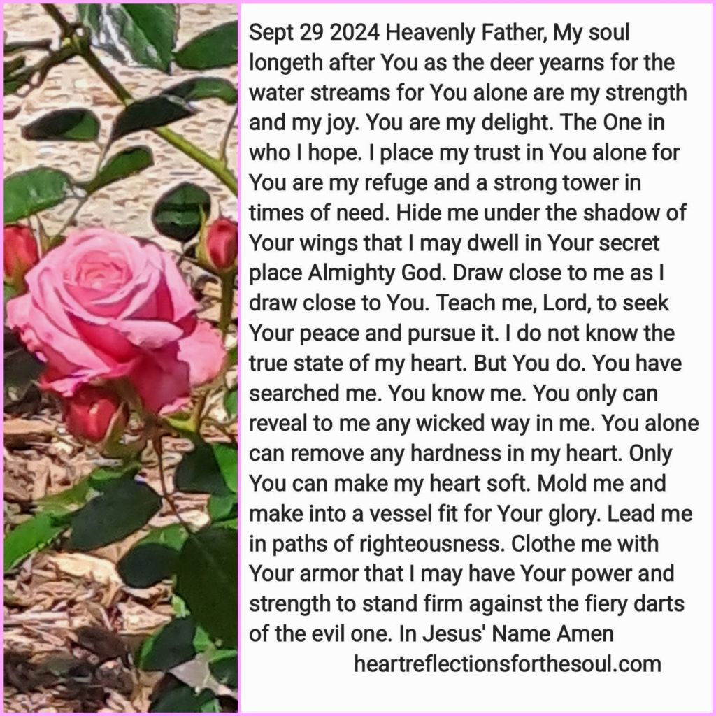 Heavenly Father, My soul longeth after You as the deer yearns for the water streams for You alone are my strength and my joy. You are my delight. The One in who I hope. I place my trust in You alone for You are my refuge and a strong tower in times of need. Hide me under the shadow of Your wings that I may dwell in Your secret place Almighty God. Draw close to me as I draw close to You. Teach me, Lord, to seek Your peace and pursue it. I do not know the true state of my heart. But You do. You have searched me. You know me. You only can reveal to me any wicked way in me. You alone can remove any hardness in my heart.Only You can make my heart soft. Mold me and make into a vessel fit for Your glory. Lead me in paths of righteousness. Clothe me with Your armor that I may have Your power and strength to stand firm against the fiery darts of the evil one. In Jesus’ Name Amen