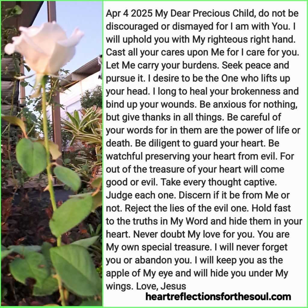 Do not be discouraged or dismayed, for I am with You. I will uphold you with My righteous right hand. Cast all your cares upon Me for I care for you. Let Me carry your burdens. Seek peace and pursue it. I desire to be the One who lifts up your head. I long to heal your brokenness and bind up your wounds. Be anxious for nothing, but give thanks in all things. Be careful of your words for in them are the power of life or death. Be diligent to guard your heart. Be watchful, preserving your heart from evil. For out of the treasure of your heart will come good or evil. Take every thought captive. Judge each one. Discern if it be from Me or not. Reject the lies of the evil one. Hold fast to the truths in My Word and hide them in your heart. Never doubt My love for you. You are My own special treasure. I will never forget you or abandon you. I will keep you as the apple of My eye and will hide you under My wings.