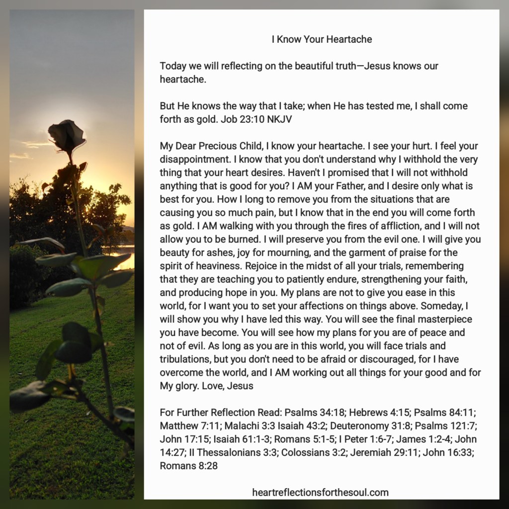 I know your heartache. I see your hurt. I feel your disappointment. I know that you don’t understand why I withhold the very thing that your heart desires. Haven’t I promised that I will not withhold anything that is good for you? I AM your Father, and I desire only what is best for you. How I long to remove you from the situations that are causing you so much pain, but I know that in the end you will come forth as gold. I AM walking with you through the fires of affliction, and I will not allow you to be burned. I will preserve you from the evil one. I will give you beauty for ashes, joy for mourning, and the garment of praise for the spirit of heaviness. Rejoice in the midst of all your trials, remembering that they are teaching you to patiently endure, strengthening your faith, and producing hope in you. My plans are not to give you ease in this world, for I want you to set your affections on things above. Someday, I will show you why I have led this way. You will see the final masterpiece you have become. You will see how my plans for you are of peace and not of evil. As long as you are in this world, you will face trials and tribulations, but you don’t need to be afraid or discouraged, for I have overcome the world, and I AM working out all things for your good and for My glory.